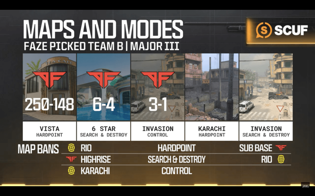 Con Heretics ya en la parte baja del torneo, y con New York y FaZe listos para medirse en la segunda ronda de winners, era el turno de los actuales campeones del Major 1, Toronto Ultra, frente al combinado de las olas, Seattle. Estos últimos venían de lograr una clasificación muy bien hecha con su nuevo jugador ’04’, el problema que se veían las caras ante unos Toronto Ultra animados por toda su ciudad. Así, los de ‘Scrap’ y compañía empezaron barriendo a sus oponentes con un gran Hardpoint en Karachi por 250 a 164 (con Envoy y Scrap firmando cada uno 30 bajas). El segundo mapa fue más de lo mismo: victoria morada por 6-3 en 6 Star ¡y con un auténtico recital de Scrap: 14/5! Los azules devolvieron el golpe en el Control (3-1) gracias a las 33 bajas de Abuzah. Sin embargo, la serie culminó en 6 Star (250-179) con una actuación colosal de Envoy (39/21).